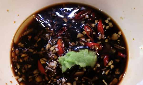 5、此时我们来调一个料针。准备一个干净的碗,碗中放入一勺生抽、一勺老醋、半勺的老抽,再放入适量的鸡精、半勺食用盐,用筷子充分搅拌均匀,此时料汁就已经调好了。