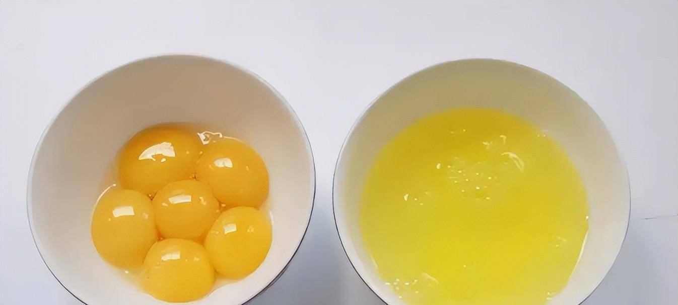 2、准备两个干净的盆,打入四五个鸡蛋,将蛋黄与蛋清分开。蛋清打散,蛋黄放到一边备用。