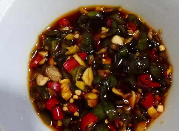 3、起锅烧油,油热以后将辣椒圈放入锅中爆炒出香味。大蒜放入腌好的芹菜的碗中,将刚刚热好的辣椒油浇在蒜沫上,激发出蒜的香味儿,芹菜中放入三勺醋,适量的香油,半勺子的鸡精,拌均匀即可开吃。