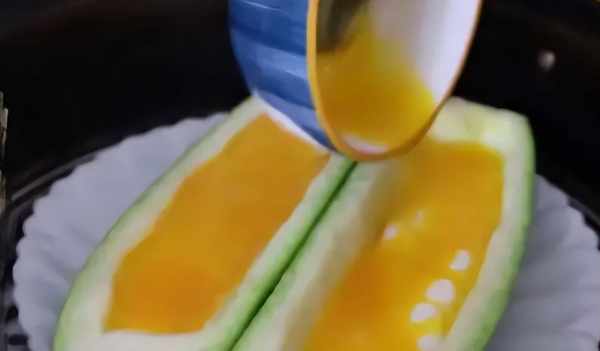 3、去掉了瓤的西葫芦我们放入蒸锅中,锅中放入水,水开以后放入西葫芦,将蛋清倒入到一个西葫芦里面,盖上盖子,蒸三分钟左右,然后将蛋黄浇在蛋清上面,用勺子将蛋黄摊匀,盖上盖子再蒸五分钟。