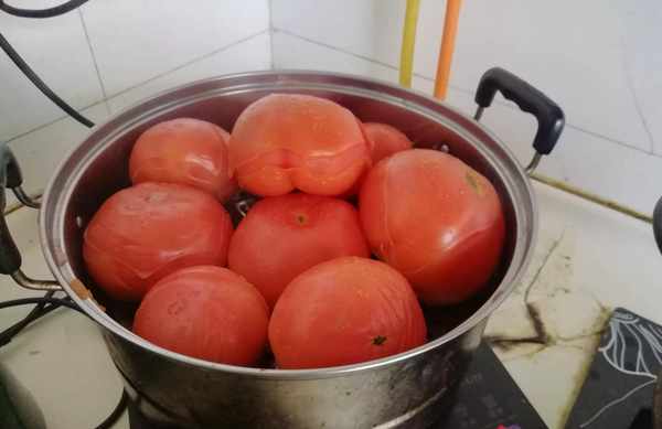 来家我就开始做准备工作,先将西红柿洗干净,蒸锅洗干净,添上半锅水,然后把西红柿放在蒸锅里开始蒸,滚锅蒸5分钟,看到西红柿皮能揭掉就行。