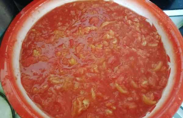蒸的西红柿在盆子里放凉20分钟后,把每一个西红柿皮揭了,然后再把每一个西红柿再一一挤碎,能挤多碎就挤多碎,这一道工序是为了下一步往瓶子里装。