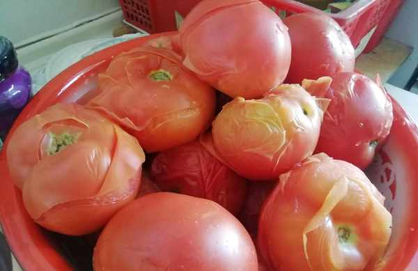 然后把蒸出来的西红柿一个一个拿出来,放在准备好的盆子里,这一道工序是为了揭掉西红柿皮。