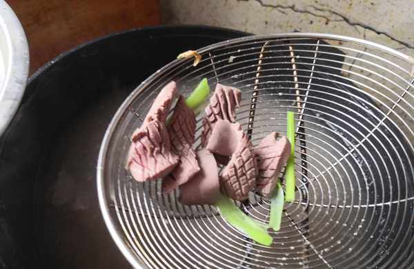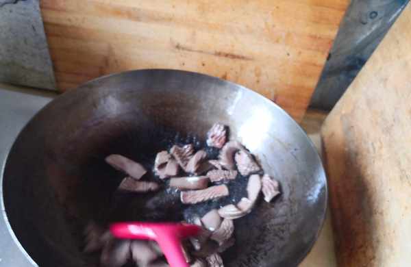 5. 另起锅,锅里放的油比炒菜时多一些,把沥干水分的腰花倒入锅里过油,时间大约在30秒左右捞出,如果时间长了腰花就会变硬,影响口感,