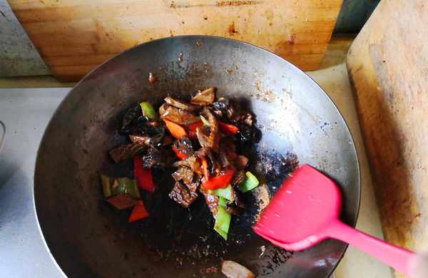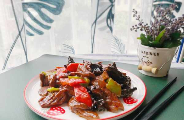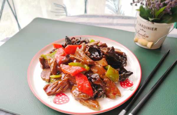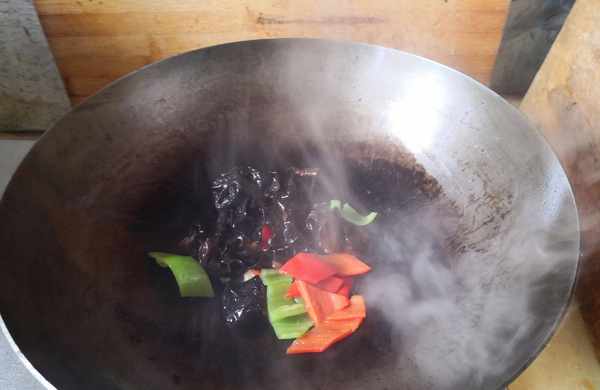 6. 锅里留适量的底油,把青红椒和木耳放入锅里翻炒,