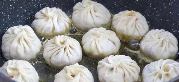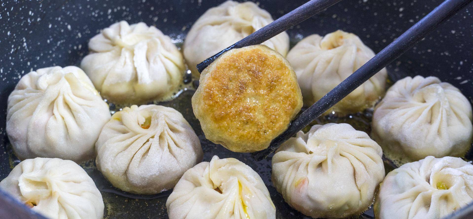 11、这个小包子除了蒸以外,其实还可以做好吃的水煎包,平底锅预热刷油,放入小包子后开中火煎,煎到底部金黄焦脆以后倒入1碗面粉水,这时候盖上盖子用大火收干水分,隔着锅盖看到锅里的水分快收干的时候就把盖子打开;