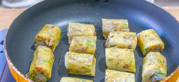 17、平底锅倒点油,放入切好的糯米卷,小火把腐皮煎一下。