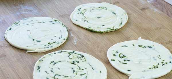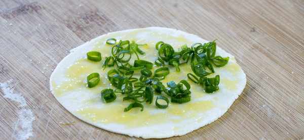 8、接着我们再来做一个层次丰富完整的大葱花饼,同样的操作,刷油后撒盐放葱花,一张叠一张,三张重叠好后用擀面杖擀开擀薄;