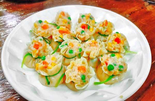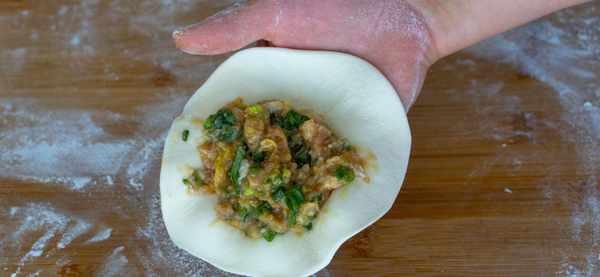 6、然后在中间放上一勺馅儿,再像包包子一样包起来,觉得饺子皮有点干不好包的可以在边边上沾点清水,这样包起来会更方便快速,包好后稍微的整理一下,一个个小巧玲珑的小包子就完成了;