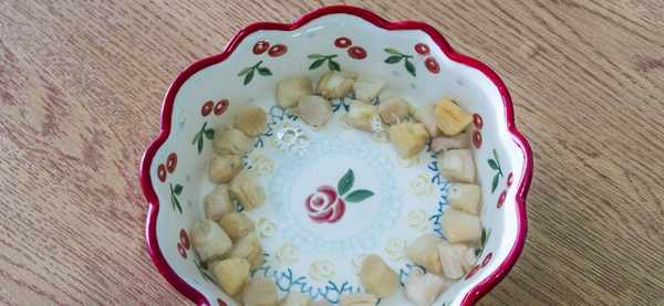 3、取出来后加清水料酒泡10个小时,最好是早上就蒸好泡起来,下班回来做时间刚刚好,泡好的花胶就是这个样子的;