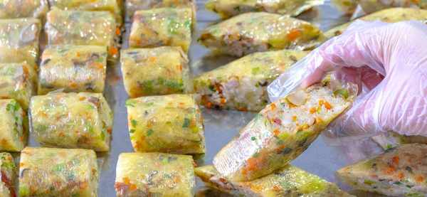 14、然后取一张出来铺上一条糯米饭,两边对着后再卷起来。