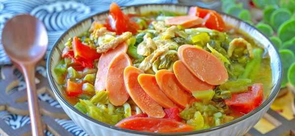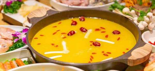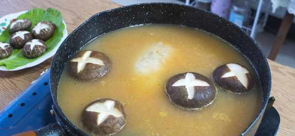 9、锅里已经小火炖了50分钟了,现在将打好的南瓜胡萝卜汁倒进来,轻轻的拌匀后再把香菇、花胶都加进来;