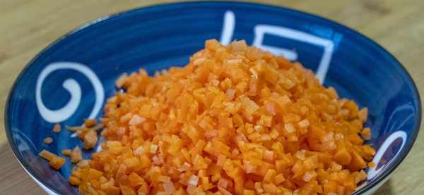 7、再来1个胡萝卜,大约是120克,去皮后先切片,再切丁,装起来后也先放一旁。
