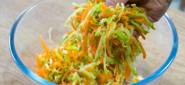 1、冰箱还有一个青萝卜和一根儿胡萝卜,洗净后先把皮削掉,直接擦成丝,接着我们往萝卜丝里面加2勺盐,拌匀后腌制30分钟,腌制过后的萝卜丝会变软,还能把里面的水分腌出来;