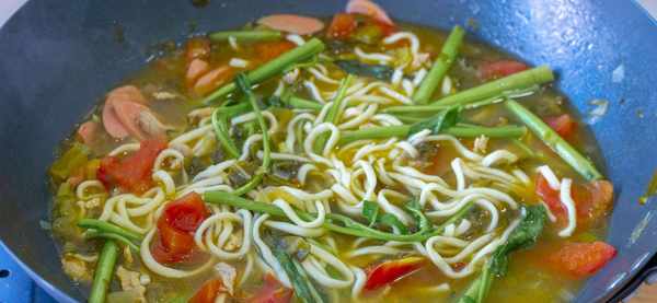 7、变色后加酸菜炒匀,再加生抽、鸡精、盐、清水,西红柿和火腿肠也倒进来。8、大火煮开后盖上小火继续煮5分钟,入味儿后下入面条。