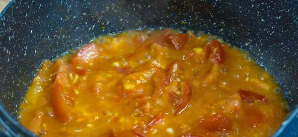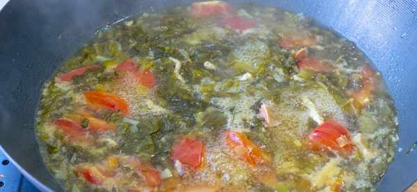 14、起锅热油,下蒜末爆香,把西红柿加进来翻炒,加一勺盐更容易出汁,炒到西红柿完全软烂后加一碗清水盖上煮开;