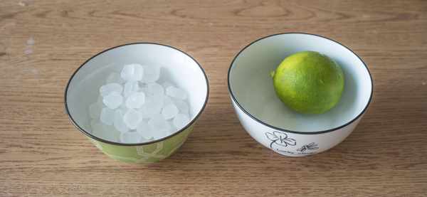 5、再准备100克冰糖和一个柠檬,柠檬洗净后对半切开,挤出柠檬汁;