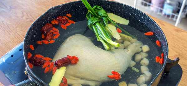 6、现在就可以将鸡腿放入锅里熬汤了,加水、姜片、葱结、1把枸杞、5颗红枣,泡好的干贝连水一起倒进来;