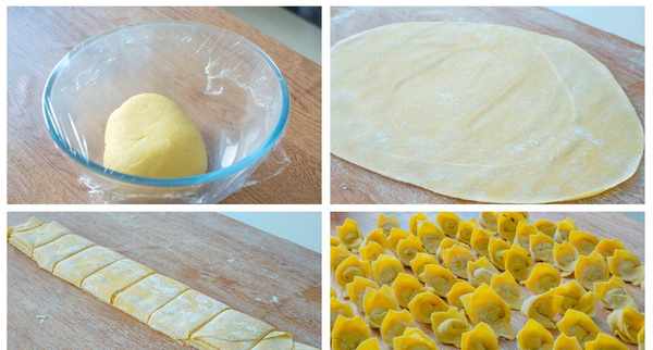 7、擀好后先折起来再切开,最后切成正方形的小方块儿,一勺肉馅儿,错交对折后再捏合,这种包法其实比较适合面皮厚一点的,成型比较好看,馄饨就全部包好了;