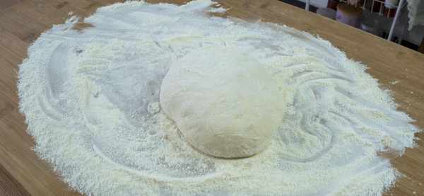 7、接着我们来做饼,面团儿开始微微发起来了,首先在砧板上多撒些干面粉,把面团儿取出来后,表面再撒些干面粉防粘,不用揉,稍微的整理下后直接用擀面杖擀开擀薄;