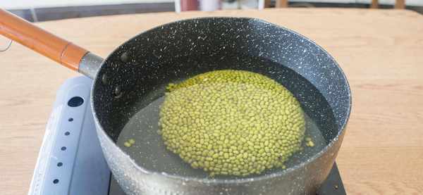 2、再烧水,锅里的水煮沸以后直接倒入绿豆,然后盖上盖子焖15分钟,15分钟以后再把绿豆放凉;