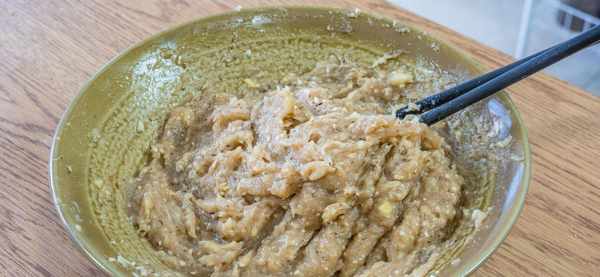 5、接着把香菇加进来后调味儿,1勺盐、少许白胡椒粉、1勺姜末、1勺蒜末、1勺生抽、1勺料酒、3勺清水,继续搅拌,一直朝着一个方向搅打至粘稠;