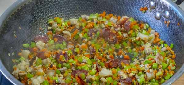 10、接着起锅热油,下肉丁倒进来翻炒,变色后把腊肠也倒进来,炒香后下芹菜、胡萝卜、香菇一起翻炒2分钟后简单调个味。