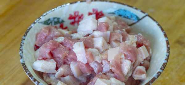 4、蒸糯米饭的时间我我们来准备配菜,猪肉150克,切成小丁后备用。