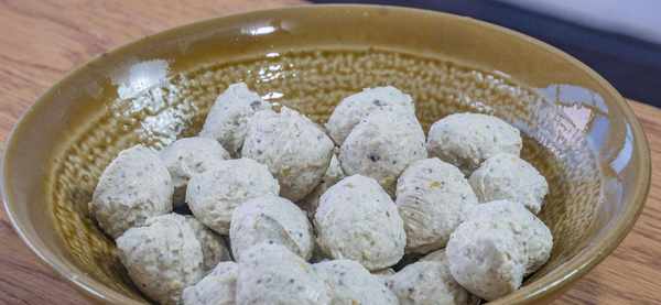 6、起锅烧水,先来捏丸子,用虎口挤出肉泥,再用勺子舀起放入锅里,超级简单的鸡肉丸子就做好了,煮丸子的水一定不能开,温水下锅就行