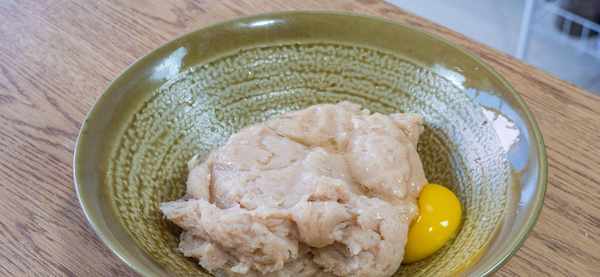 4、打好的鸡胸肉泥中再来1颗鸡蛋,顺着一个方向搅打上劲儿;