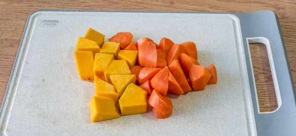 8、接着我们来准备1块儿老南瓜和1个胡萝卜,去皮后切成小块儿,加清水用料理机打成汁备用;