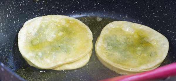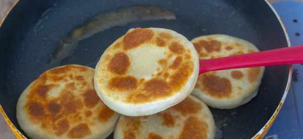 11、平底锅预热刷油,放入面饼,表面再刷一层油锁住水分,盖上盖子用中火烙,烙至一面金黄后翻烙另一面,两面都变成金黄色后出锅;