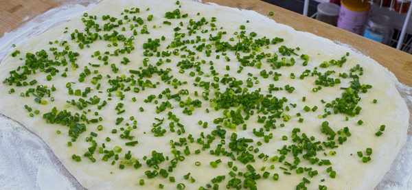 8、擀成一大张长方形的面饼表面刷油,再撒少许的盐和适量葱花;