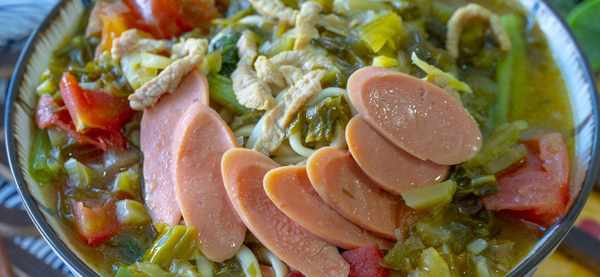 食材:酸菜、面条、西红柿、火腿肠、肉丝、青菜、葱、姜