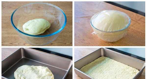 3、面团儿发酵好后取出来,不用排气直接放入烤盘里面,用短一点的擀面杖擀开擀匀,用叉子戳小洞排气就行,盖上干净的湿布进行二次醒发;