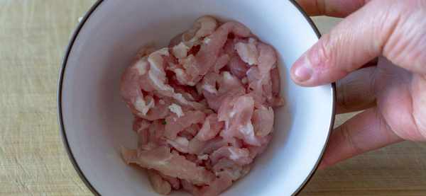 2、醒面的时间我们来个丸子汤,2块儿鸡胸肉先切小块儿,然后加到绞肉机中打成泥,先盛出来;