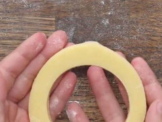 8.在饼干的同心圆外圈部位,也就是饼干圈的部位,涂上白色巧克力酱,然后将同心圆饼干两两贴在一起。
