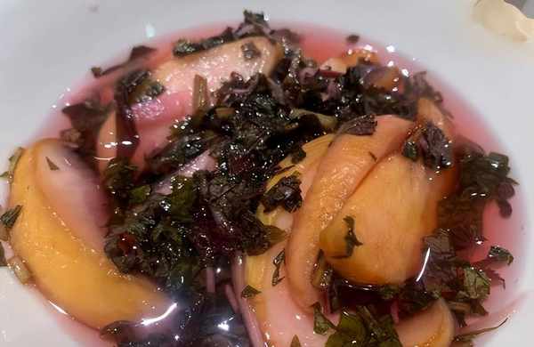 紫苏桃子姜,是从长沙冬瓜山宵夜摊流行起的做法。它的做法有点像水果罐头,用冰糖,把夏天最嫩的仔姜,香气极盛的脆桃,用紫苏和杨梅腌在一起,就是紫苏桃子姜,口感清爽脆甜。