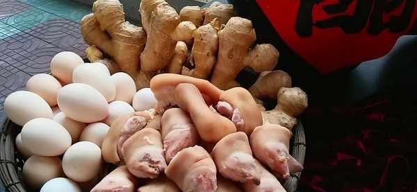 猪脚姜做法:1)姜去皮后切片,猪脚处理干净后切块,飞水后用冷水冲洗掉血沫;2)在炒锅里不放油将姜片煎干水分,再将猪脚放入炒锅里煎干水分;3)取一个瓦罐晾干水分,倒入一瓶添丁甜醋,放入煎干水分的猪脚和姜片,可再加少许红糖,用小火煮沸后,再煮10分钟转小火,焖几个小时;4)再放入煮熟的鸡蛋,用小火煮沸后盖上盖焖即可。整个制作过程都不要加水,如果姜醋汁不够,可以再放入添丁甜醋。