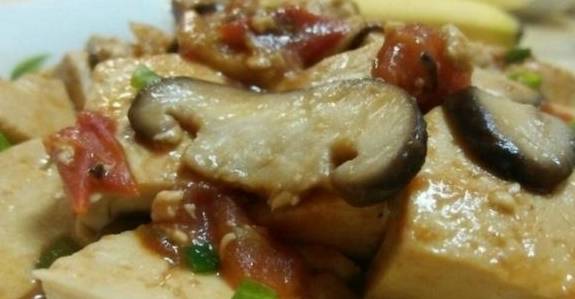 1、葱姜切末,豆腐冲洗一下切成小块,用淡盐水浸泡10分钟,香菇洗净切片,加入开水中焯烫一下捞出沥水备用;