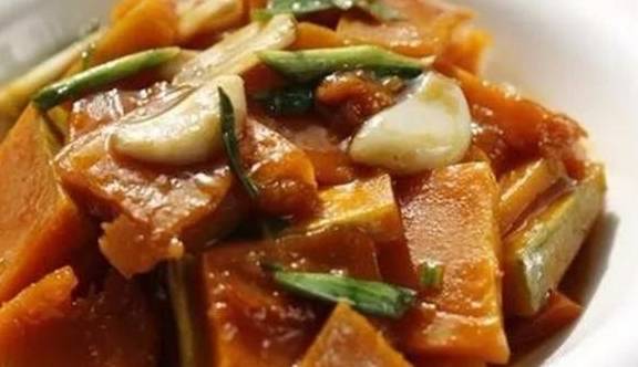 2、起锅烧热倒油,加入蒜片煸炒出香味后,倒入南瓜片翻炒均匀,淋入适量蚝油和清水,加盖继续炖煮3分钟,最后调入少许生抽和盐炒匀即可出锅。