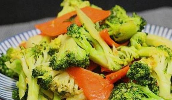 2、起锅烧热倒油,加入蒜末爆香后,放入胡萝卜片煸炒至变软,倒入西兰花略微翻炒几下;