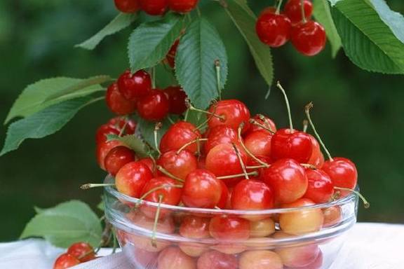 外表色泽鲜艳、晶莹美丽、红如玛瑙,黄如凝脂,果实富含糖、蛋白质、维生素及钙、铁、磷、钾等多种元素。樱桃可以缓解贫血。用于脾胃虚弱,少食腹泻,或脾胃阴伤,口舌干燥;肝肾不足,腰膝酸软,四肢乏力,但是不能多吃。