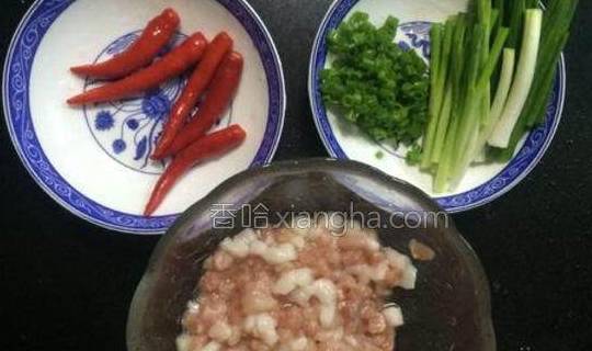 3.猪肉切成肉末,加料酒拌匀备用。小葱洗净后大部分切成葱段,小部分切成葱末,小米椒洗好备用