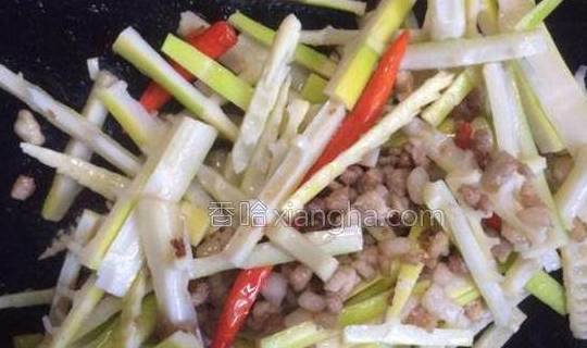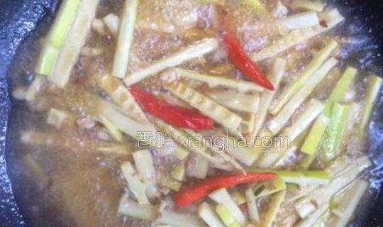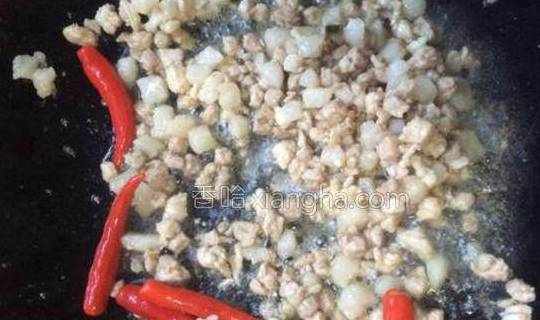 6.炒锅中放入肉末翻炒片刻,炒出肉香后将小米椒煸炒至断生。