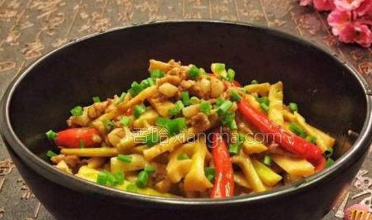 配料:春笋300g、香葱30g、猪肉100g、小米椒3-5个、食用油适量、生抽适量、老抽少量、料酒适量、盐适量烹饪步骤:1.将春笋剥好