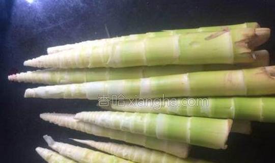 2.将春笋根部老的切除,洗净,然后将笋切成细条,放入沸水中焯一下,去除苦涩味,沥干水分