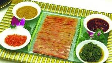 :1、牛里脊去掉牛皮,牛肉、牛皮加葱段、姜片、料酒、干辣椒、干花椒腌24小时,取川式卤水大火烧开,改小火卤50分钟,取出牛皮先垫入大盘底,再放入牛肉,用大盘将牛肉、牛皮压实,静置10小时,取出切长10厘米、宽4厘米的大片,码放在盘中。2、小米辣粒、酱油、味精10克调成鲜辣汁;青菜籽捣碎,加鲜汤调匀,放入容器内密封后放在30℃左右的地方静置1小时,取出加蒸鱼豉油、味精10克调成芥末汁;椒放在明火上烧焦,去皮切碎,加葱油、盐、味精10克调味成烧椒汁。4、调好的三款味汁与干辣椒末跟牛肉上桌食用。