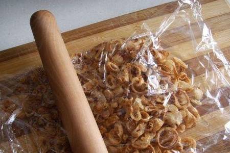 6、6.将炸好的洋葱圈装在保鲜袋里,用橄面仗将其压碎即可.