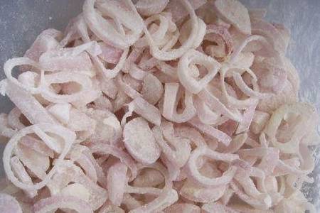 3、3.在洋葱圈里撒两茶匙干面粉,使每片洋葱圈上都沾有干面粉